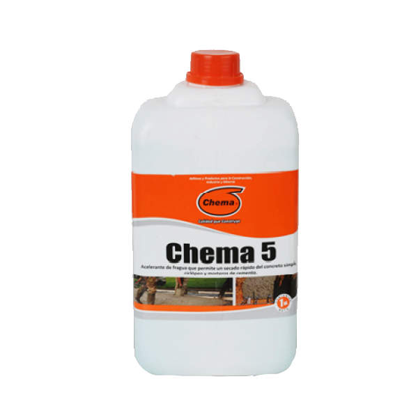 Chema 5 es un acelerador de fragua para concreto simple, ciclópeos, pastas de cemento, morteros. Proporciona altas ganancias tempranas de f´c (resistencia a la compresión) disminuyendo el tiempo de fragua.